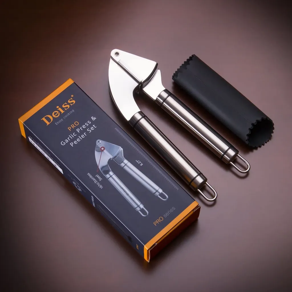Deiss PRO Knoblauchpresse Und Silikon-Knoblauchschäler-Set – Bestes Werkzeug Zum Sekundenschnellen Zerkleinern Von Knoblauch Und Ingwer – Rostfreier Edelstahl Und Extrem Leicht Zu Reinigen – Spülmaschinenfest