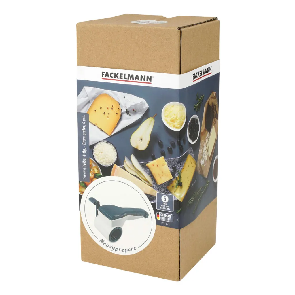 Fackelmann Trommelreibe Easyprepare, Hochwertige Küchenreibe Mit 3 Verschiedenen Einsätzen Für Scheiben, Feine Und Grobe Raspel, Ergonomischer Griff (Farbe: Weiß / Blau-Grau), 1x 4 Teile